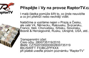 Přispějte i Vy na provoz RaptorTV.cz! I malá částka pomůže šířit to, co jinde neuvidíte a co jiní přehlíží nebo nechtějí vidět. Natáčíme a vysíláme nejen v Praze a Česku, ale celé V4, Německu, Rakousku, Švýcarsku, Francii, Itálii, Chorvatsku, Srbsku, Slovinsku, Bosně & Hercegovině, Rusku, Ukrajině, USA, atd… Běžný účet: …